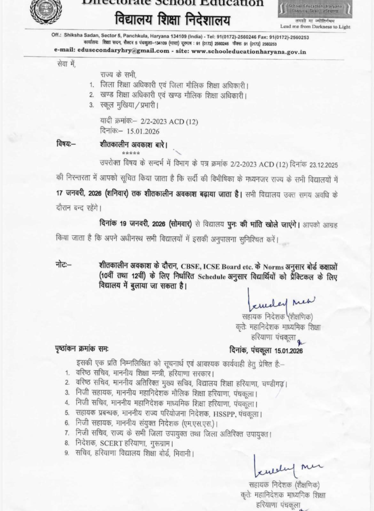 हरियाणा में शीतकालीन अवकाश बढ़ा, 19 जनवरी से खुलेंगे स्कूल | शिक्षा निदेशालय का आदेश
